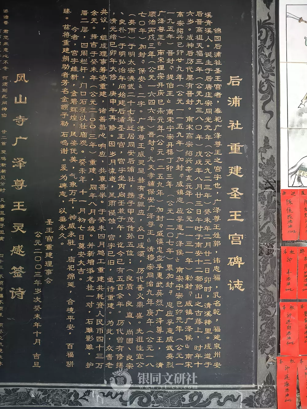 锦园后浦社圣王宫者,泰祀广泽尊王之宫宇也,广泽尊王姓郭,讳忠福,乳名乾,福建泉州安溪青溪人。诞生于后唐庄宗同光元年(公元九二三年)癸未年二月廿二日卯时,清溪梓里。成道于后晋高祖天福三年(公元九三八0年)戊戌年八月廿三日午时于南安十二都郭山之古藤上,时年十六岁。成神后历代屡有晋封。南宋高宗绍兴辛亥元年(公元一一三一年)勅封“威镇广泽候”;南宋一九五年)晋封“提伯王”;南宋宁宗开禧丁卯三年(公元一二0七年)累加封“忠应孚惠威武英烈广泽尊王”;南宋理宗开庆巳未元年(公元一二五九年)加封“威镇忠应孚惠武英烈广泽尊王”;清顺治丙戍三年(公元一六四六年)晋封“九天孝辅保安广泽尊王”0清穆宗同治九年庚午(公元一八七0年)加封“保安”二字。广泽尊王威灵显赫有求辄应,众口咸颂,历代香火鼎盛。先祖性宜公(英而)于明太宗洪武二十七年迁居同安后浦社,携子甲茂传孙五位:(良质、良直、尚圃、良宗、良朴)于明弘治年间始建后浦圣王宫,宫宇坐丙向壬兼子午,讫今已有五百余年。历代曾有修缮,清光绪己卯年大修,庚申年再修。因岁月流逝,风雨侵蚀,宫宇已旧,亟待重建。为此,众耆老共议,组成理事筹资重建,诸善热心响应,共襄善举。于癸未四月鸠工重建共耗资人民币四十三万余元。择吉于癸未年(公元二00三年)重建,同年八月告竣。并新增添龙柱一对,石雕影雕,护厝二层,四周栏杆,门口石程以壮观。癸未年十一月初七日奠安大吉。