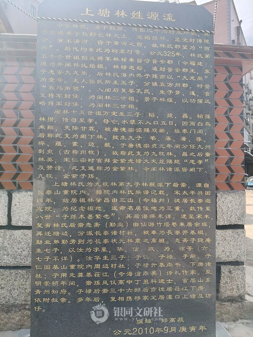 上塘林氏为九牧林第九子林蔇派下后裔,源自长泰山重院内。据院内林氏族谱记载,宋太平兴国四年,始居祖林肇昌由三山(今福州)徙居长泰迴龙院,为纪念祖地,遂命名居住地为三重。数传至八世“子孫未甚繁也”,其后谱牒未详。逮至宋未,复有林氏后裔悫斋(勤业)由仙游竹塔巷来居余坂,再迁塘边,分派长泰诸村社,被奉为長秦开基祖。勤业弟勤劳则为长泰状元林震之高祖。悫斋子隐庵生七子,以汝为字辈,华、信、政、为、谅等(六、七子不详)。汝华生三子:子仁、子禄、子用。子仁固基山重院內周边村社;子禄开基尚书、下房诸社;子用先奠基荘江(今海滄鼎美)诗礼传家。至明崇祯年间,裔孫凤仪高中丁丑科进士,官居山东青州知府。子禄后裔三十六郎后亦徙居茌江下房依附叔亲。多年后,复相携移家定居灌口上塘及坊仔。