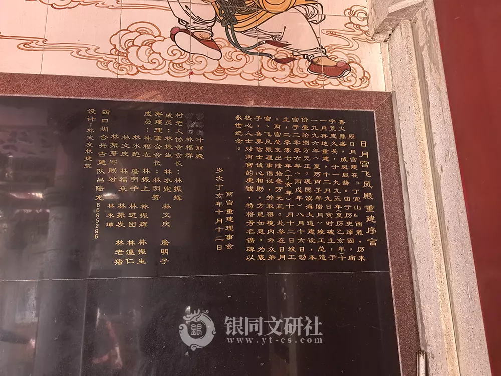 原日月宫建在丁宜山西麓,历来香火鼎盛,威灵显赫。由于历史原因,庙宇荒废久矣,于一九九五年(夏历乙亥年)十一月再地重建,十二月九日寅时破土,于一九九六年(夏历丙子年腊月)竣工总造价壹拾捌万元正。现因滨海大道建设,本宫于二零零六年(丙戌年)八月十六日动土,二零零七年(丁亥年)十月十二日竣工,两宫总支出陆拾参万元正。此举在日月宫 、飞凤殿理事倡议,并取得境内外众第子,各界信士诚心相助,方能如愿。为褒热心人士对两宫的虔诚,特将芳名镌碑以永世纪念。