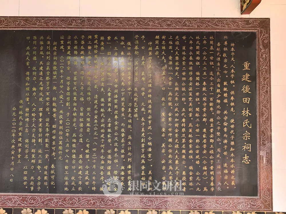 后田林氏始祖系金紫派下,乃真虎嫡亲。为生计而到潘涂投靠其伯叔。长大後移居天马山下开荒营生。而後肇基于後田。与潘涂长、二、三房为兄弟。历世与潘涂同迎奉金紫公及迎奉冬祖。灯号「金紫」,昭穆五宗统一「文章资国本,忠孝振家声。世德贻谋远,编恩赐庆荣」。缘因谱牒遗失,后田林氏宗祠始建于何年也无从查考。据重建时发现地契分金记载,清道光壬寅年公元一八四二十月二日午时兴工动土修建。虽经几次维修,但久经风霜,已有破损。今逢盛世,子孙瓜瓞绵绵。得亨太平之福,皆赖祖德宗公遗。益念祠建千年饮水思源扬祖德,世蕃百代怀恩拓本焕宗光。为缅怀祖德宗功。故成立宗祠重建理事会,倡导筹谋劈划。于二0一0年三月廿八日动工依原地址重建。二0一0年十月廿八竣工。共投资捌拾伍万陆仟元