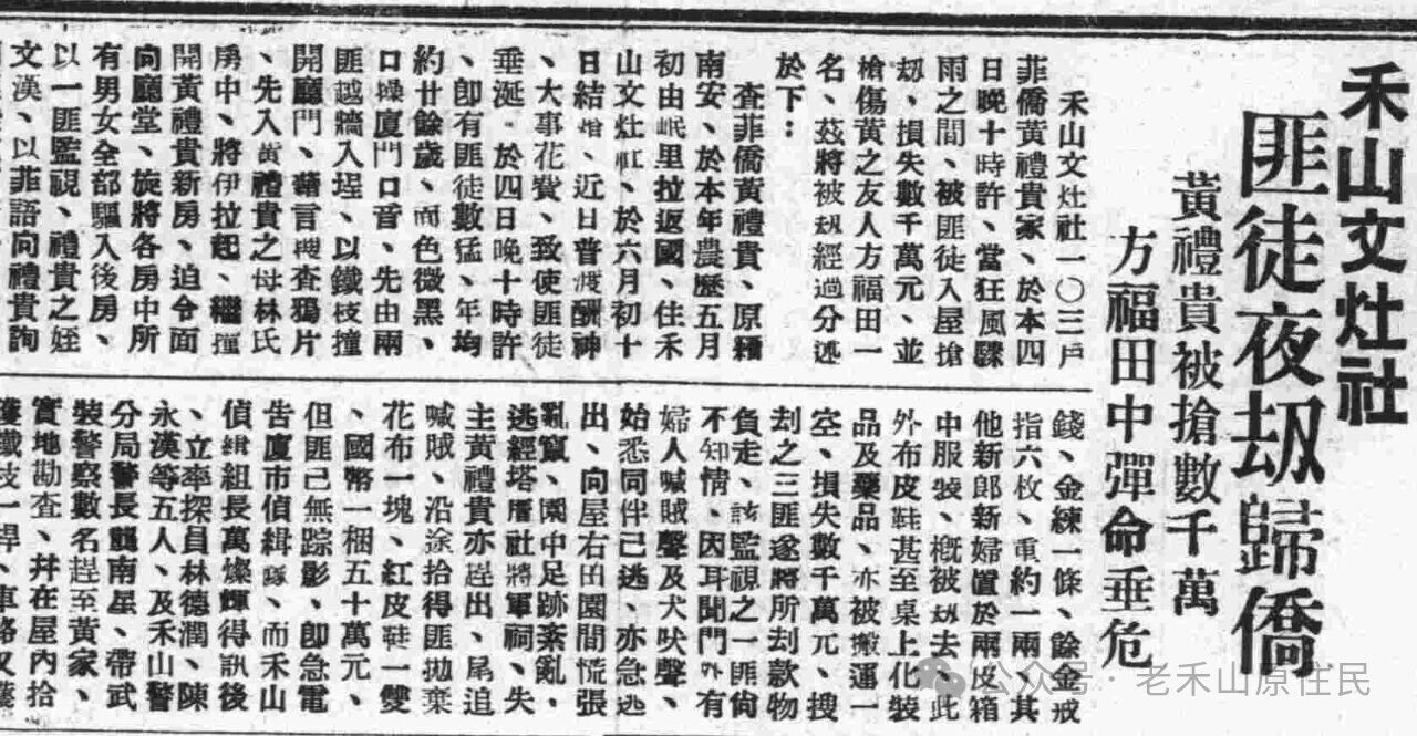 禾山文灶社华侨黄礼贵1947年5月从马尼拉返乡,6月结婚。9月6日,一帮匪徒手持铁器撬开房门,除了劫去金银衣物,就连桌子上的化妆品以及药物也被搬运一空。
