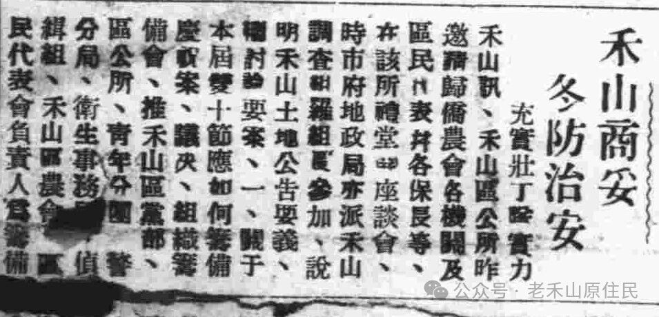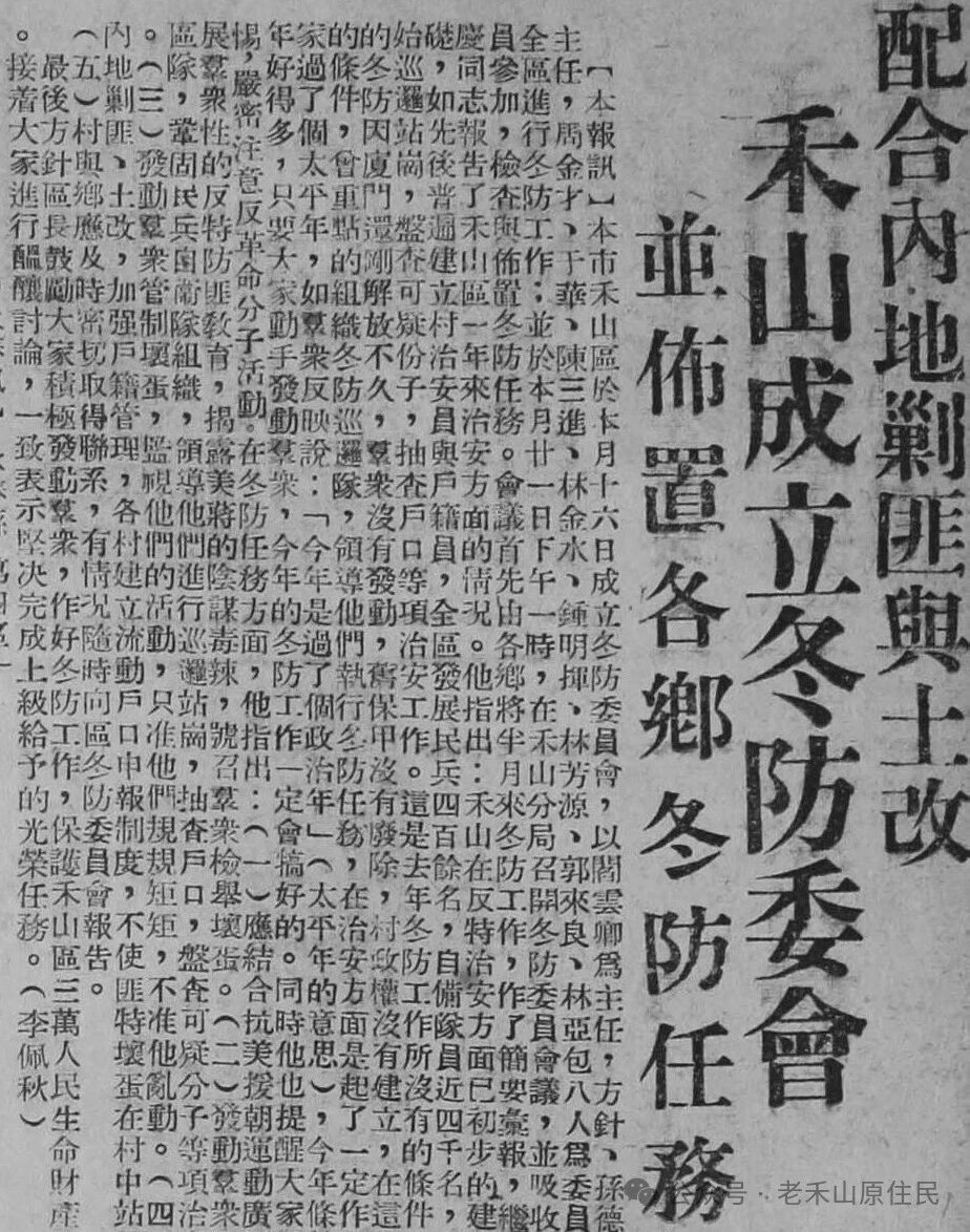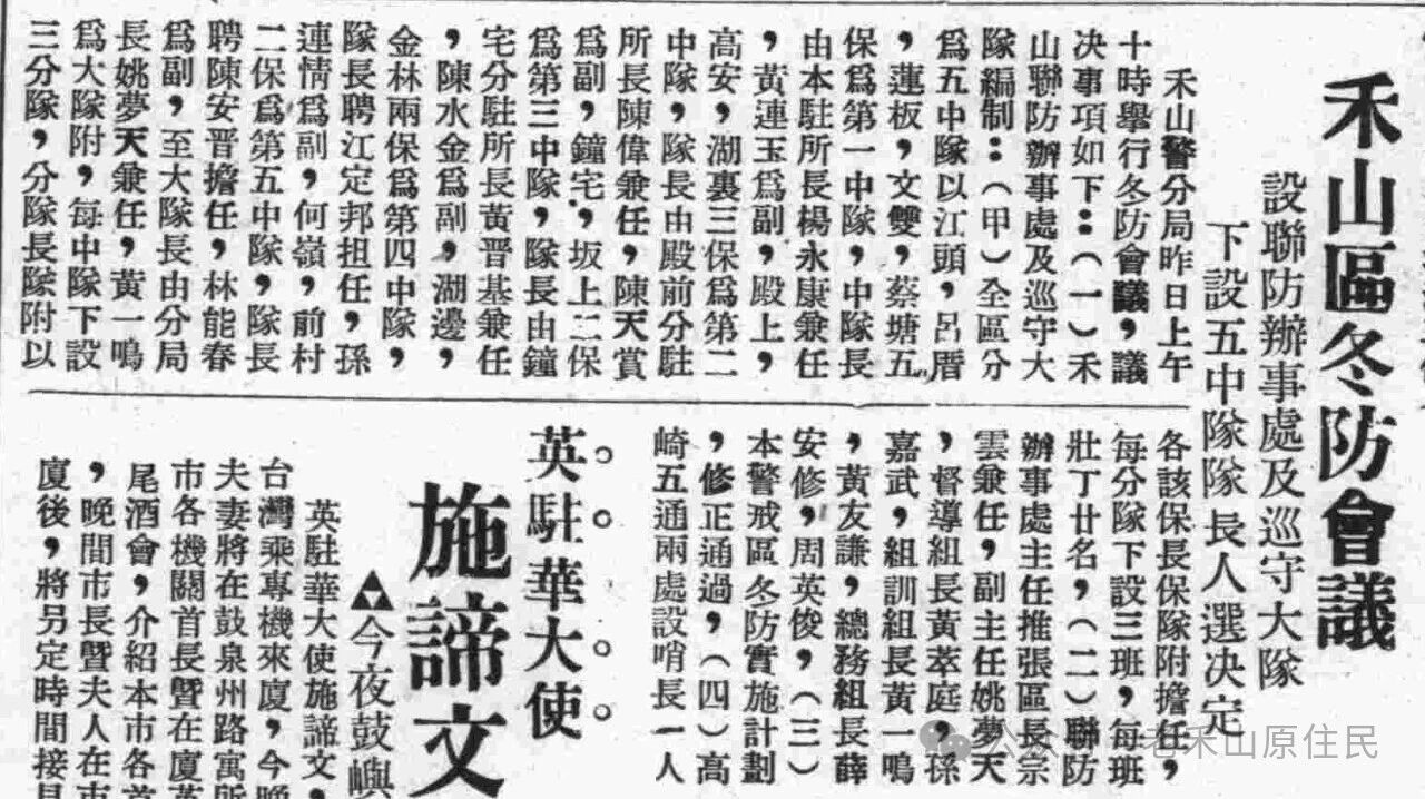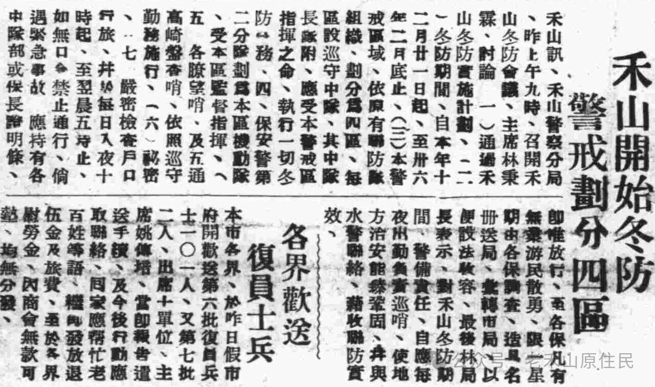 1946年冬防期间,自12月21日起至来年(1947)2月底止,禾山的警戒划为四区,每区设巡守中队,队长队副受警戒区之命,执行一切冬防任务。保安警第二分队为机动队,各瞭望所及五通高崎盘查哨,依照巡守勤务施行。每晚入夜10时起至翌日晨5时,如无户口本禁止通行。(《江声报》1946.11.28)