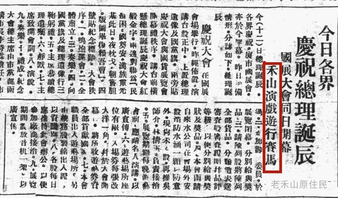 1946年9月3日,禾山举行庆祝“九三”抗战胜利周年大会,会后除了演出之外,还“在江头保跑马”。当年的《江声报》也作了报道,《禾山庆祝胜利周年欢乐通宵达旦》:“……午后,江头保演戏、跑马及种种娱乐。”